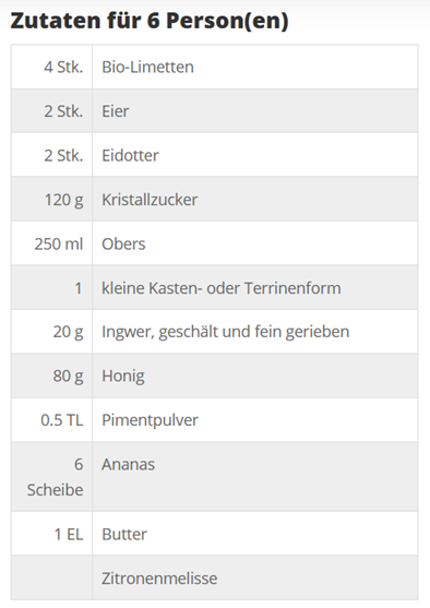 Die Ananasscheiben mit Butter bestreichen, mit der Marinade beträufeln und im auf 220 °C vorgeheizten Backofen (Grillfunktion) 2–3 Minuten auf der obersten Schiene grillen, herausnehmen und auf Tellern anrichten. Das Parfait aus der Form stürzen, die Folie entfernen und das Parfait in Portionen schneiden, mit den Ananasscheiben anrichten und das Limetten-Parfait mit Zitronenmelisse garnieren.